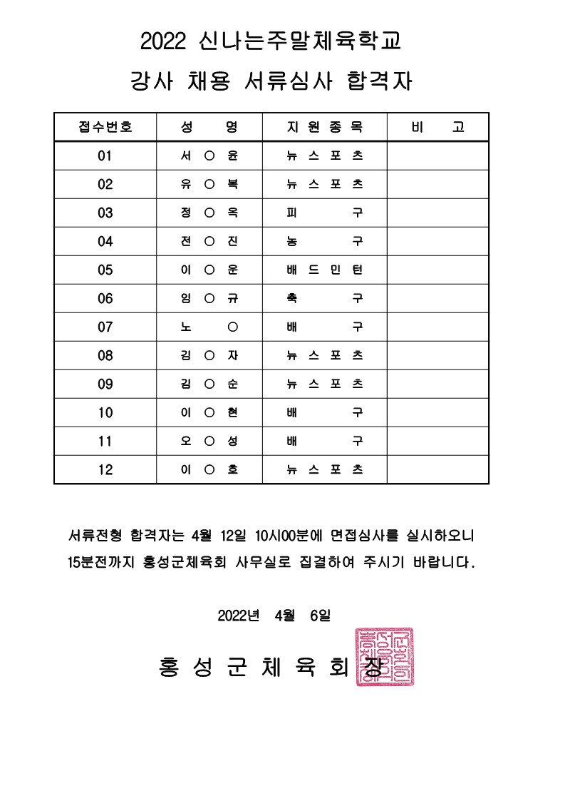 페이지 정보 제목[공고] 2022년 신나는주말체육학교 학교 안 강사 모집 서류전형 합격자 발표 작성자홍성군체육회 작성일2022-04-06 16:55:49 조회 7,755 공유하기 페이스북으로 보내기 트위터로 보내기 링크 https://hongseongsports.com/data/editor/2204/… ( 4206회 연결 ) 본문 이전글 [공고] 홍성군테니스협회 회장 선거일정 공고 다음글[공고] 홍성군체육회 직원 공개채용 최종합격자 공고 및 임용후보자 등록요령 안내 목록